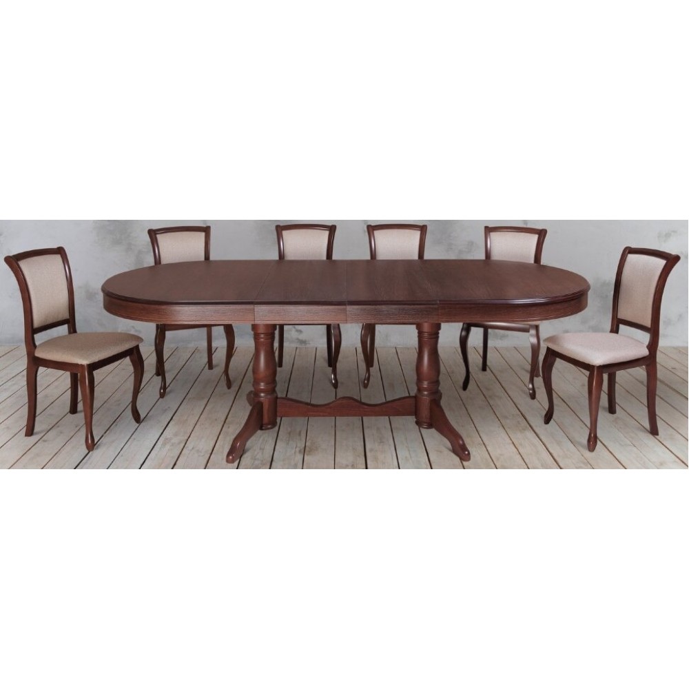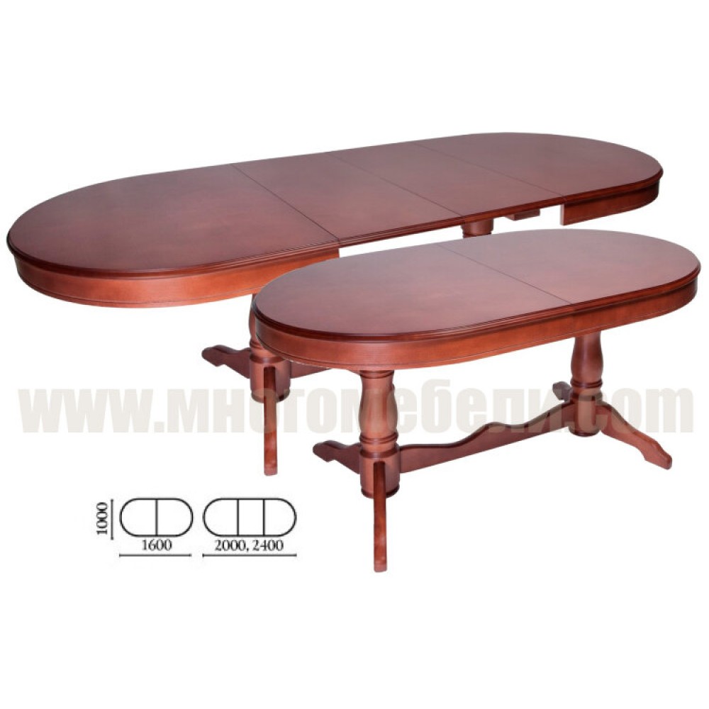 Раскладной овальный стол на двух точеных ножках, которые между собой соединены перекладиной. Стол раздвижной, в сложенном виде размер 100х160 см., 2 отдельные вставки по 40 см. позволяют изменять длину до 200 см и 240 см. соответственно. В собранном виде вставки убираются внутрь стола. Такой стол станет отличным вариантом для загородного дома. Стол изготавливается из массива бука. Столешница выполнена из МДФ с натуральным шпоном дуба.
